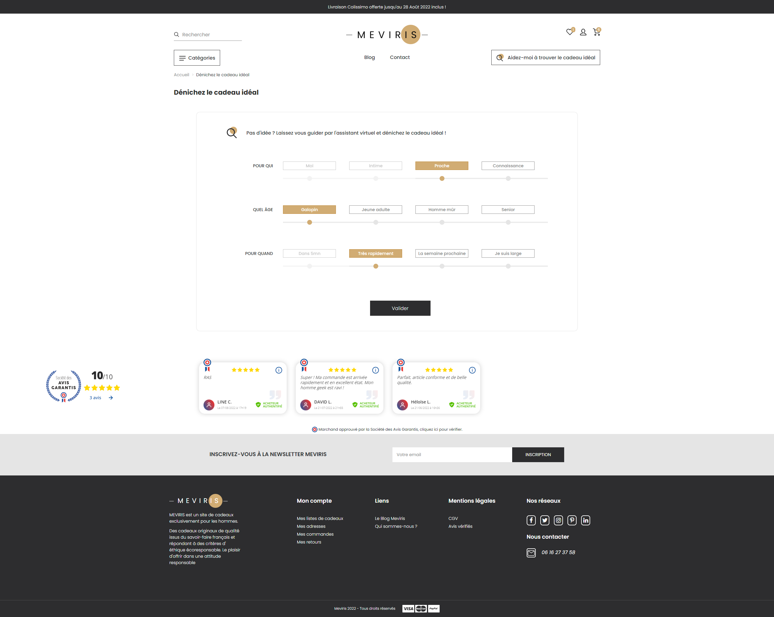 Boutique en ligne de cadeaux pour hommes exclusivement. Une volonté du client de mettre en avant un système de navigation original en privilégiant une sorte de wizard, outil permettant de découvrir une sélection de cadeaux ciblé selon le profil de l’homme à qui l’on veut offrir.